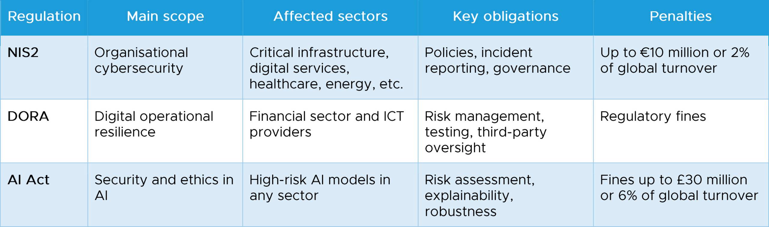 - If an AI model is used in a environment regulated by DORA or NIS2, it must comply with the requirements of both frameworks.