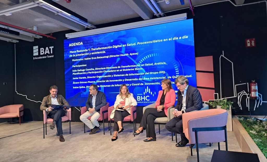 The event continued with a roundtable titled “Digital Transformation in Healthcare: Processes/Data in Everyday Care and Service Delivery”, featuring: Xabier Eroa, Health Director at Ayesa; Inés Gallego, Director of Health Transformation: Analysis, Planning, and Citizen Participation, Basque Government; Javier Garate, Director of Organization and Information Systems at IMQ Group; Álvaro Gómez–Meana, Director of Innovation and Development, Healthcare Area at Quirónsalud; e Iratxe Ijalba, Director of Information Systems and Innovation Coordinator at Mutualia.