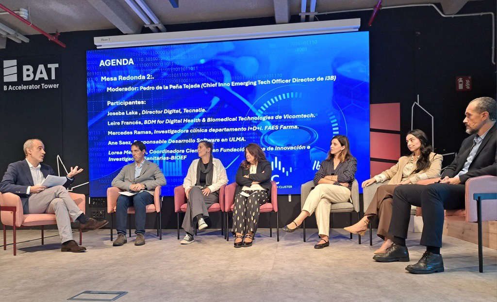 Next came the presentation “The Biosanitary Industry in the Basque Country” by María Aguirre, Head of Health and Social Transition at SPRI, followed by the second roundtable “Collaborative Innovation in Digital Health: Connecting Capabilities to Transform the System”, which included: Pedro de la Peña, Chief Inno Emerging Tech Officer, i3B (R&D unit at Ayesa); Joseba Laka, Digital Director at Tecnalia; Leire Frances, BDM for Digital Health & Biomedical Technologies at Vicomtech; Iban Arriola, Head of the Health Sector at Tekniker; Mercedes Ramas, R&D Department, Faes Farma; Ane Saez, Software Development Lead at ULMA; y Lorea Mendoza, Scientific Coordinator, Basque Foundation for Health Innovation and Research (BIOEF).