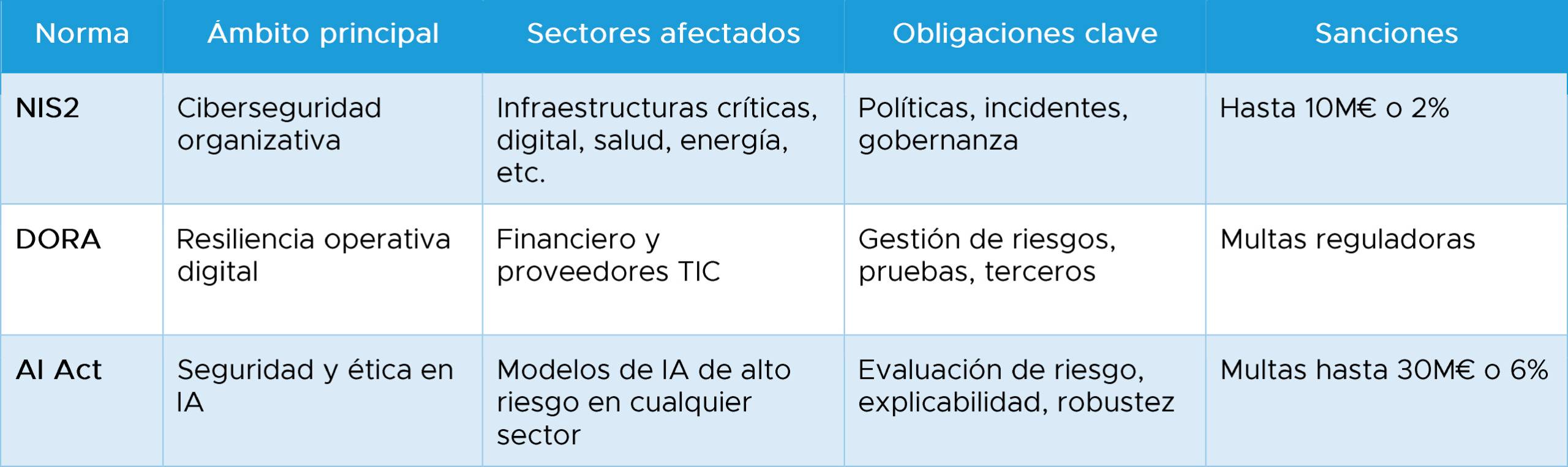 La entrada en vigor de NIS2, el Reglamento DORA, y el inminente impacto de la AI Act conforman una tríada normativa que afecta de forma transversal a empresas tecnológicas, infraestructuras críticas, entidades financieras, aseguradoras, y desarrolladores de inteligencia artificial.
